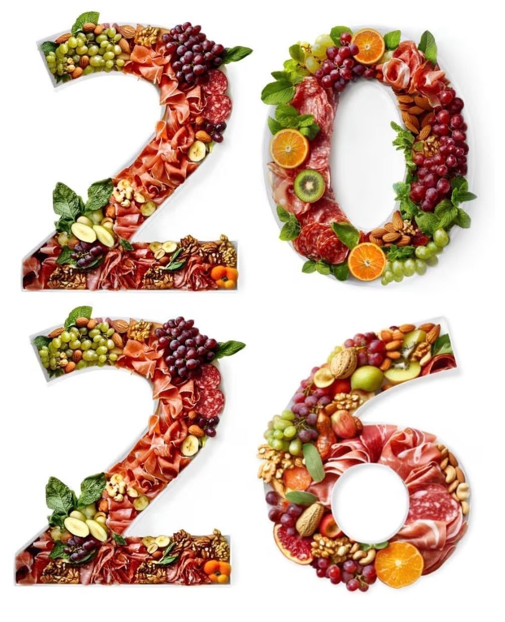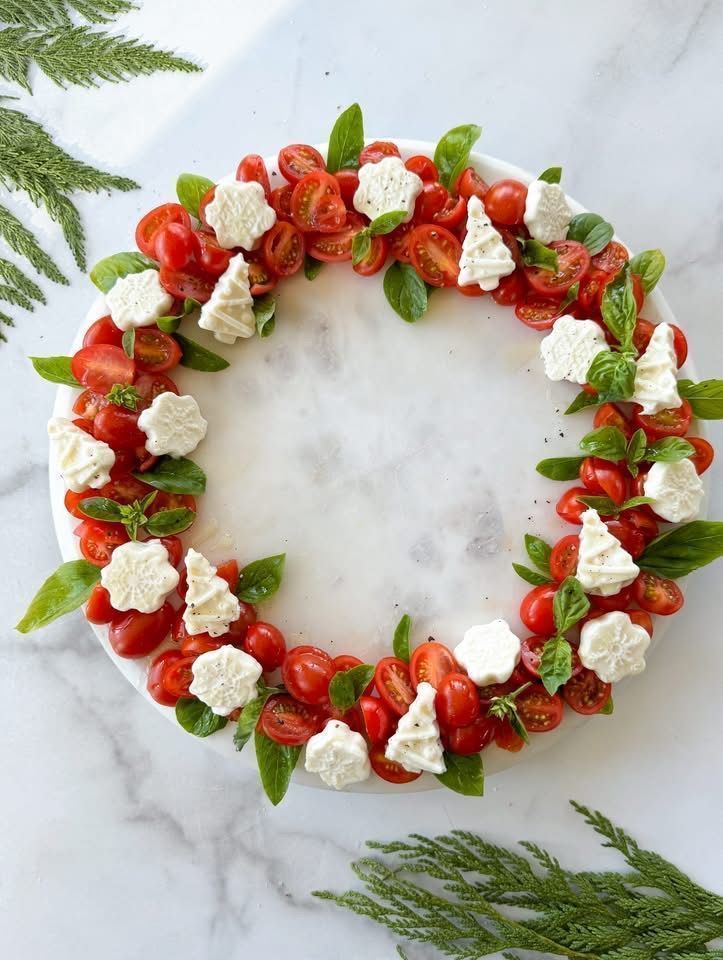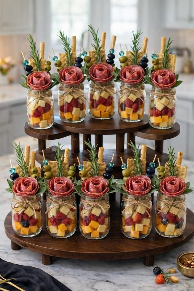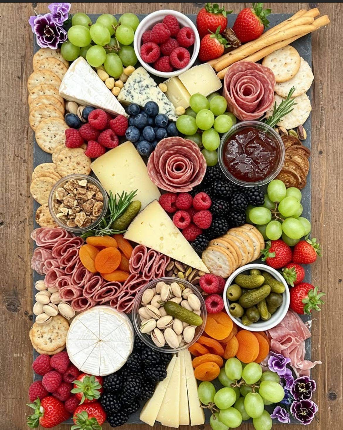 A lavish artfully arranged spread of bite-size foods. Cheeses, cured meats, fruits, nuts, dips, breads and vegetables
